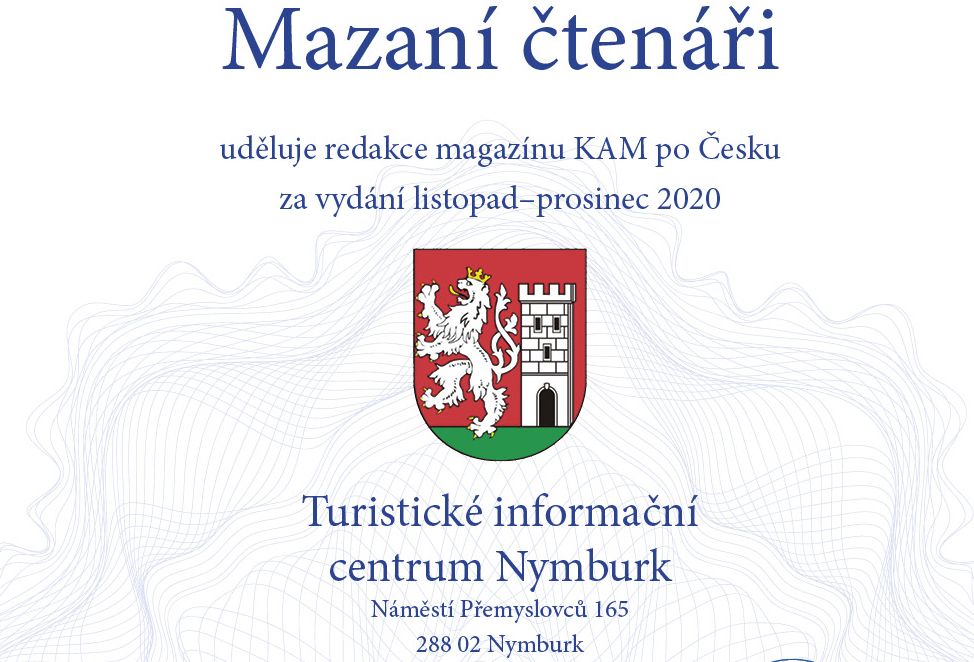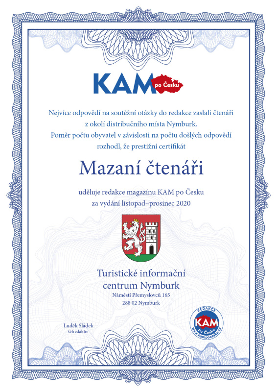 Nejvíce odpovědí na soutěžní otázky do redakce zaslali čtenáři z okolí distribučního místa Nymburk. Poměr počtu obyvatel v závislosti na počtu došlých odpovědí rozhodl, že prestižní certifikát Mazaní čtenáři uděluje redakce magazínu KAM po Česku za vydání listopad–prosinec 2020 Turistické informační centrum Nymburk Náměstí Přemyslovců 165 288 02 Nymburk