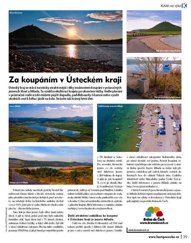 Ústecký kraj se stává turisticky atraktivnější i díky možnostem koupání v průzračných jezerech Most a Milada. Ta vznikla rekultivací krajiny po ukončení těžby. Vedle plavání v průzračné vodě si zde můžete půjčit šlapadla, paddleboardy či kanoe nebo využít okolních cest k běhu i jízdě na kole. Strávíte tak krásný letní den.