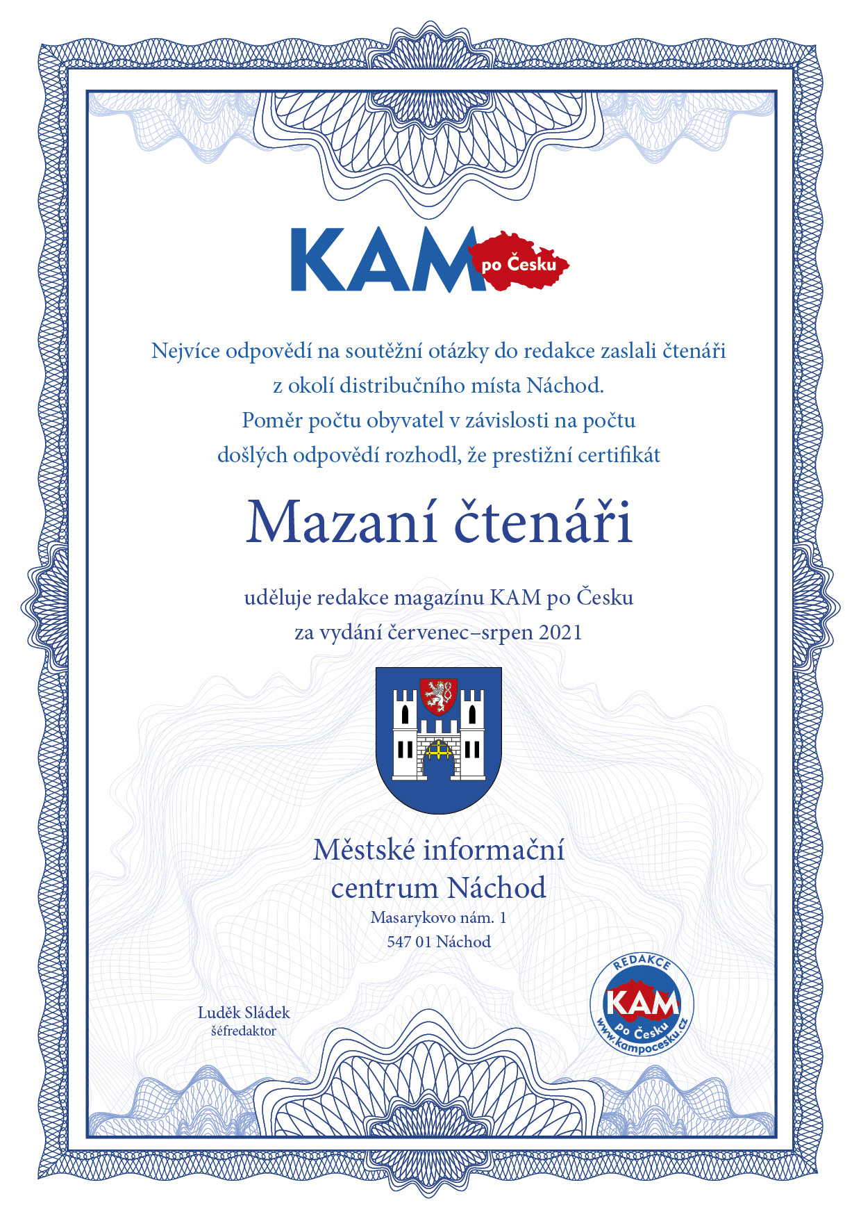 Nejvíce odpovědí na soutěžní otázky do redakce zaslali čtenáři z okolí distribučního místa Náchod. Poměr počtu obyvatel v závislosti na počtu došlých odpovědí rozhodl, že prestižní certifikát