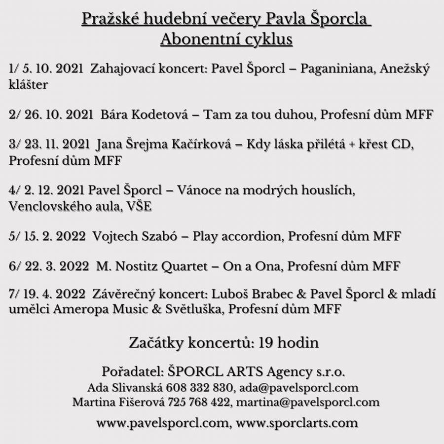 Po 30 letech skončil kytarista Lubomír Brabec s pořádáním abonentního cyklu „Pražské hudební večery“ a předal žezlo svému kamarádovi, houslistovi Pavlu Šporclovi, který bude v Pražských hudebních večerech pokračovat.