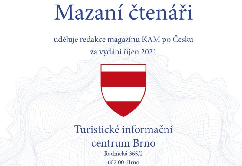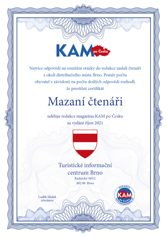 Nejvíce odpovědí na soutěžní otázky do redakce zaslali čtenáři z okolí distribučního místa Brno. Poměr počtu obyvatel v závislosti na počtu došlých odpovědí rozhodl, že prestižní certifikát Mazaní čtenáři uděluje redakce magazínu KAM po Česku za vydání říjen 2021