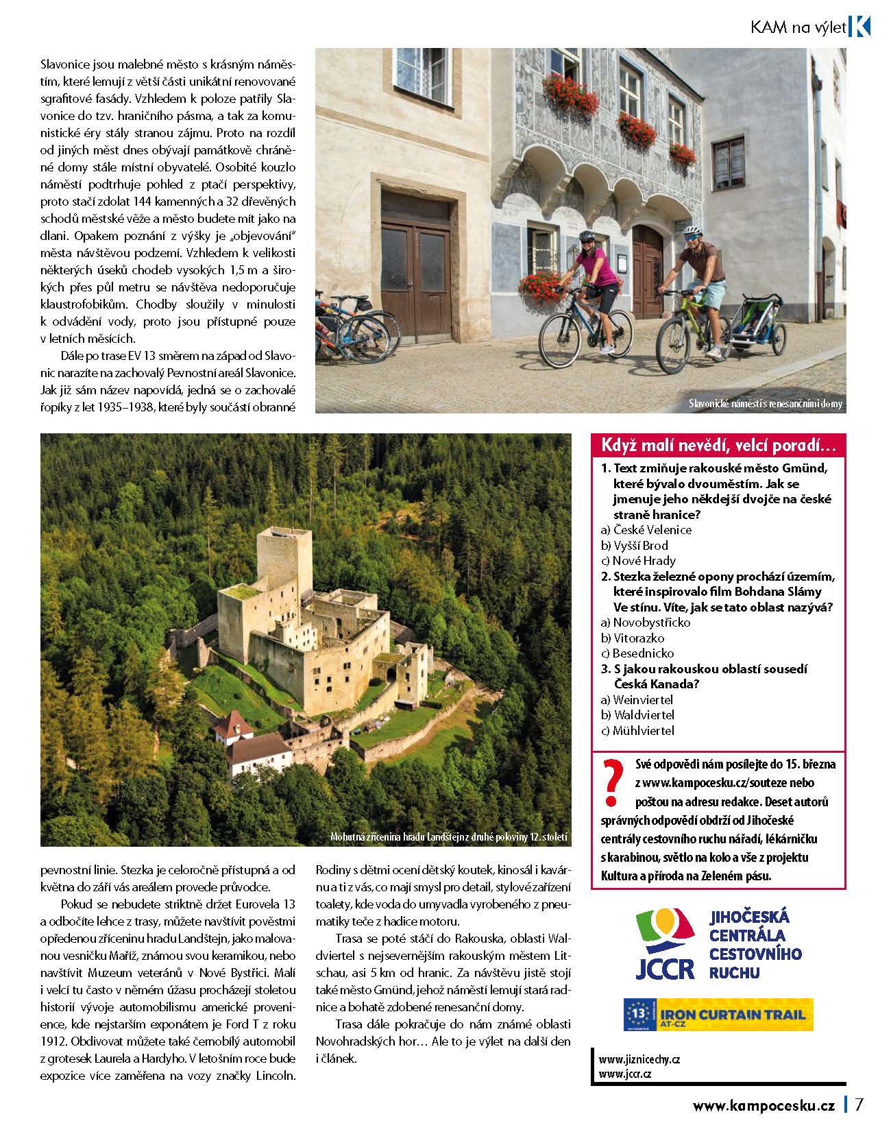 Cyklovýlet můžete začít například ve Slavonicích, zvaných malá Telč, v oblasti České Kanady. Slavonice jsou malebné město s krásným náměstím, které lemují z větší části unikátní renovované sgrafitové fasády. Vzhledem k poloze patřily Slavonice do tzv. hraničního pásma, a tak za komunistické éry stály stranou zájmu. Proto na rozdíl od jiných měst dnes obývají památkově chráněné domy stále místní obyvatelé. Osobité kouzlo náměstí podtrhuje pohled z ptačí perspektivy, proto stačí zdolat 144 kamenných a 32 dřevěných schodů městské věže a město budete mít jako na dlani. Opakem poznání z výšky je „objevování“ města návštěvou podzemí. Vzhledem k velikosti některých úseků chodeb vysokých 1,5 m a širokých přes půl metru se návštěva nedoporučuje klaustrofobikům. Chodby sloužily v minulosti k odvádění vody, proto jsou přístupné pouze v letních měsících.