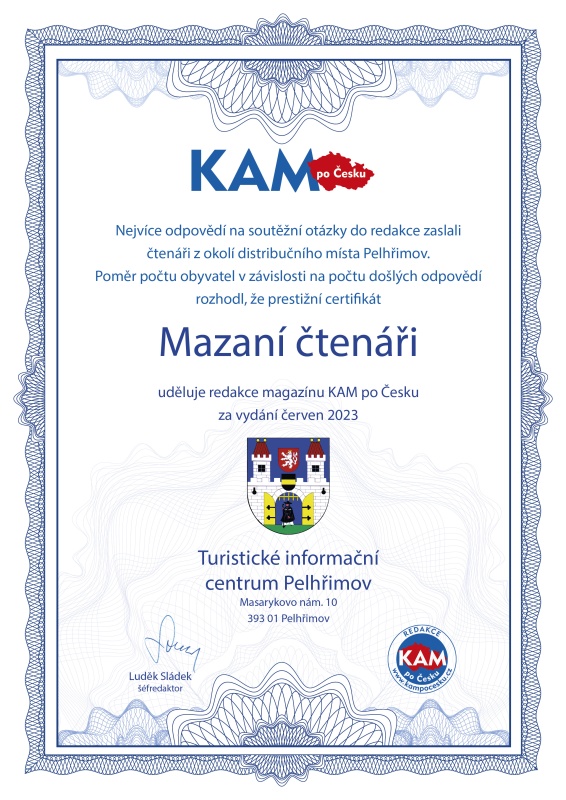 Poměr počtu obyvatel v závislosti na počtu došlých odpovědí rozhodl, že prestižní certifikát Mazaní čtenáři uděluje redakce magazínu KAM po Česku za vydání červen 2023