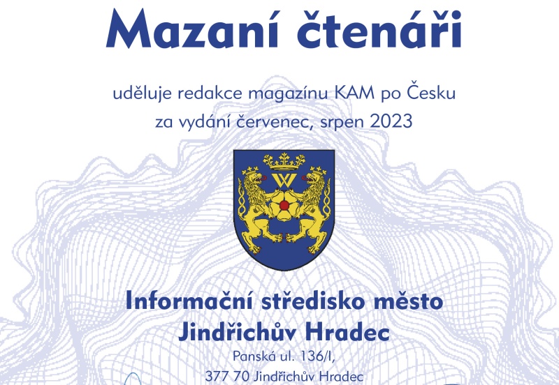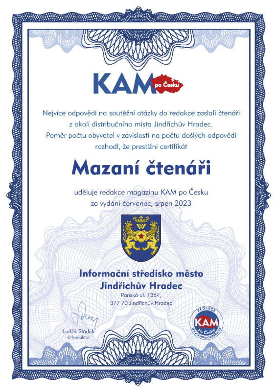 Nejvíce odpovědí na soutěžní otázky do redakce zaslali čtenáři z okolí distribučního místa Jindřichův Hradec. Poměr počtu obyvatel v závislosti na počtu došlých odpovědí rozhodl, že prestižní certifikát Mazaní čtenáři uděluje redakce magazínu KAM po Česku za vydání červenec, srpen 2023