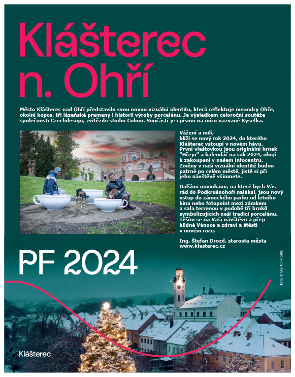 Vážení a milí, blíží se nový rok 2024, do kterého Klášterec vstoupí v novém hávu. První vlaštovkou jsou originální hrnek "Hřeju" a kalendář na rok 2024, obojí k zakoupení v našem infocentru. Změny v naší vizuální identitě budou patrné po celém městě, jistě si při jeho návštěvě všimnete. Dalšími novinkami, na které bych Vás rád do Podkrušnohoří nalákal, jsou nový vstup do zámeckého parku od letního kina nebo fotopoint mezi zámkem a sala terrenou v podobě tří hrnků symbolizujících naší tradici porcelánu. Těším se na Vaši návštěvu a přeji klidné Vánoce a zdraví a štěstí v novém roce.