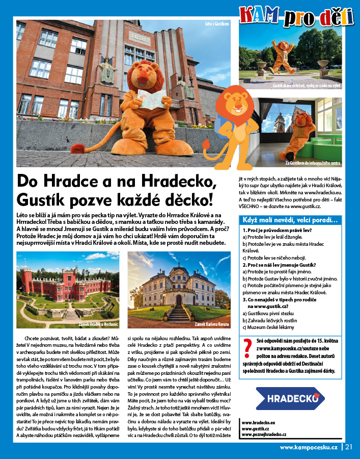 Léto se blíží a já mám pro vás pecka tip na výlet. Vyrazte do Hrrradce Králové a na Hrrradecko! Třeba s babičkou a dědou, s mamkou a taťkou nebo třeba s kamarády. A hlavně se mnou! Jmenuji se Gustík a milerád budu vaším lvím průvodcem. A proč? Protože Hradec je můj domov a já vám ho chci ukázat! Hrdě vám doporučím ta nejsuprrrovější místa v Hradci Králové a okolí. Místa, kde se prostě nudit nebudete.