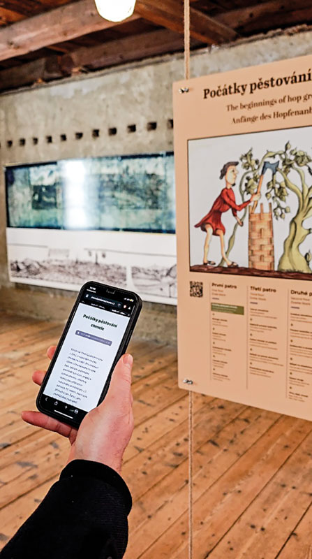 Pro lepší orientaci jsou jednotlivé místnosti opatřeny informačními tabulemi s přehledem expozic a jejich pořadí a QR kódem. Ten stačí načíst a v telefonu se automaticky zobrazí (nebo i přehraje) text s konkrétní informací o aktuální expozici a exponátech, které máte před sebou. Během jediné návštěvy tak můžete pohodlně prozkoumat technologický proces zpracování chmele, historii chmelařství na Žatecku nebo se dozvědět zajímavosti o nástrojích a zařízeních, jež formovaly věhlas našeho zeleného zlata. Vydejte se do největšího chmelařského muzea na světě, ponořte se do historie, oprašte své vzpomínky z chmelových brigád a potom navštivte nejbližší restauraci a zážitek umocněte zlatavým mokem z našeho nejlepšího chmele!