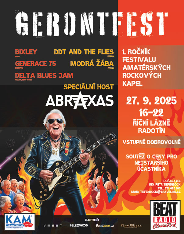 V sobotu 27. září 2025 od 16:00 vás zveme do přírodních Říčních lázní v Praze Radotíně na 1. ročník veteránského beatového festivalu GerontFest.