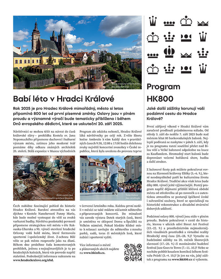 Rok 2025 je pro Hradec Králové mimoi-ádný, město si letos připomíná 800 let od první písemné zmínky. Oslavy jsou v plném proudu a významné výročí bude tematicky přiblíženo i během Dnu evropského dědictví, které se uskuteční 20. září 2025.