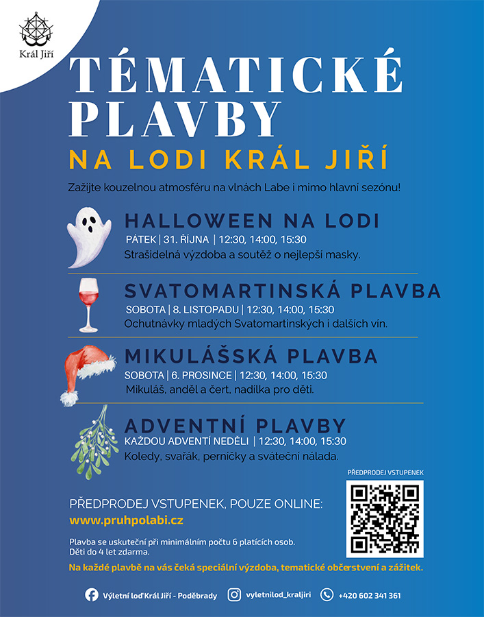 Vydejte se na plavbu výletní lodí král Jiří. Kotvíme v Poděbradech. Nabízíme plavby pro veřejnost, firemní akce i školní výlety. Plujeme k soutoku Labe a Cidliny nebo k Nymburku a zpět.