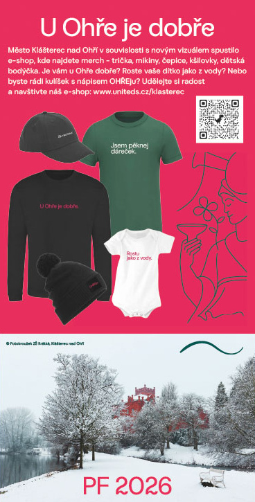 Město Klášterec nad Ohří v souvislosti s novým vizuálem spustilo e-shop, kde najdete merch - trička, mikiny, čepice, kšilovky, dětská bodýčka. Je vám u Ohře dobře? Roste vaše dítko jako z vody? Nebo byste rádi kulíšek s nápisem OHŘEju?