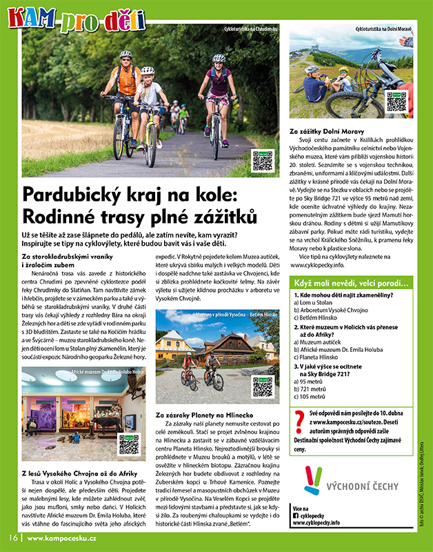 Trasa v okolí Holic a Vysokého Chvojna potěší nejen dospělé, ale především děti. Projedete se malebnými lesy, kde můžete zahlédnout zvěř, jako jsou mufloni, srnky nebo daňci. V Holicích navštívíte Africké muzeum Dr. Emila Holuba, které vás vtáhne do fascinujícího světa jeho afrických expedic. V Rokytně pojedete kolem Muzea autíček, které ukrývá sbírku malých i velkých modelů. Děti i dospělé nadchne také zastávka ve Chvojenci, kde si zblízka prohlédnete kočkovité šelmy. Na závěr výletu si užijete klidnou procházku v arboretu ve Vysokém Chvojně.