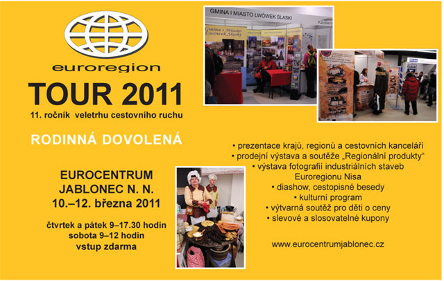 11. ročník veletrhu cestovního ruchu Euroregion Tour 2011 se uskuteční 10.–12. března 2011, EUROCENTRUM JABLONEC N. N. čtvrtek a pátek 9–17.30, sobota 9–12, vstup zdarma