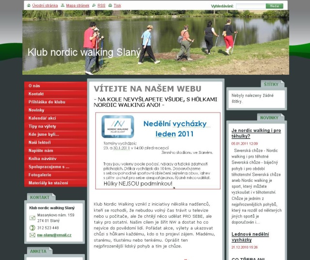 Pokrok prostě nelze zastavit. Zasahuje do všech lidských činností a sport nevyjímaje. Už si nepředáváme informace o pochodech, výletech a vycházkách jen ústně. Používáme k tomu mobilních telefonů, facebooku, twitteru a v neposlední řadě i internetu… Informace k severské chůzi nebo chcete-li k nordic walkig budeme zveřejňovat na našich nově spuštěných stránkách http://klub-nw-slany.webnode.cz/. Budeme rádi, když se nám podaří vás poučit a přesvědčit o výhodách nw chůze. Na stránkách se můžete zapojit do diskuse, najdete tam přehled plánovaných akcí na kalendářní rok, tipy na výlety apod. Věříme, že vás naše aktivity osloví, přijdete mezi nás a že se taky na naše stránky budete rádi vracet.