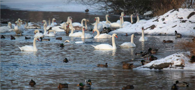 Ze zamrzlých stojacích vod řek a rybníků se sem stahují divoké kachny a labutě.