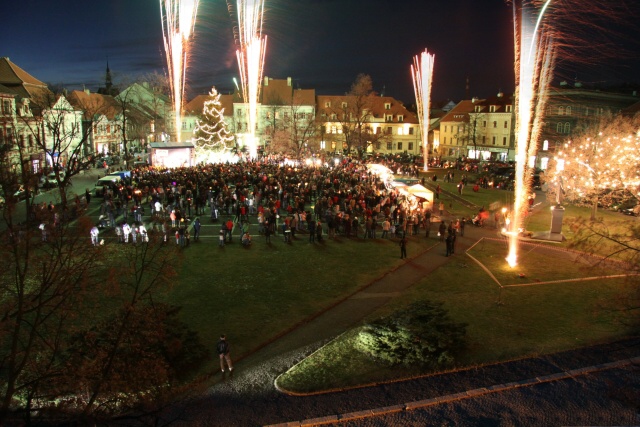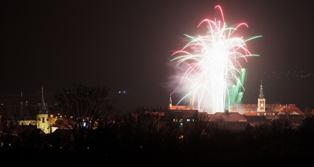 Oslava příchodu nového roku na Masarykově náměstí (velkolepý ohňostroj s hudebním doprovodem).