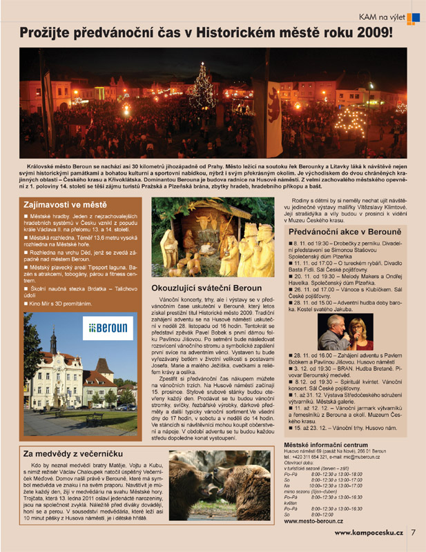 Vánoční koncerty, trhy, ale i výstavy se v předvánočním čase uskuteční v Berouně, který letos získal prestižní titul Historické město 2009. Tradiční zahájení adventu se na Husově náměstí uskuteční v neděli 28. listopadu od 16 hodin. Tentokrát se představí zpěvák Pavel Bobek s první dámou folku Pavlínou Jíšovou. Po setmění bude následovat rozsvícení vánočního stromu a symbolické zapálení první svíce na adventním věnci. Vystaven tu bude vyřezávaný betlém v životní velikosti s postavami Josefa, Marie a malého Ježíška, ovečkami a reliéfem krávy a oslíka.