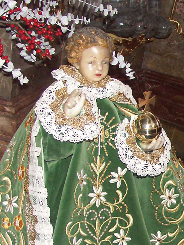 Pražské Jezulátko, soška, jejíž originál je uctíván v kostele Panny Marie Vítězné, pochází ze Španělska, kde byla pravděpodobně zhotovena někdy v druhé polovině 16. století (nebo dříve). Když se vévodkyně Marie Manrique de Lara vdávala do Čech (1556), dostala sošku od své matky svatebním darem a její ovdovělá dcera Polyxena z Lobkovic ji věnovala (1628) klášteru bosých karmelitánů u kostela Panny Marie Vítězné. Soška je vysoká 47 centimetrů, představuje Ježíše ve věku několika málo let, je oblečená do dlouhé splývavé košilky. Jádro je vyřezáno ze dřeva, potaženo snad plátnem, a povrch je vymodelován z poměrně křehkého barevného vosku, chráněného stříbrným pouzdrem (do pasu). Pravici má zdviženou k požehnání, v levé dlani drží symbol vlády nad světem – říšské jablko s křížkem. Nejcennějšími klenoty byly jednak dnes již ztracená kopie řádu Zlatého rouna a dále pak dvě korunky z dílen pražských zlatníků (vyrobené 1767 a 1810). Za třicetileté války byla soška málem zničena během vpádu saských vojsk do Prahy (1631). Teprve roku 1637 nalezl pohozenou sošku Lucemburčan otec Cyril od Matky Boží, měla ulomené obě ruce, otec Cyril však dosáhl toho, že Jezulátku byly vyrobeny ručičky nové. Roku 1655 byla soška korunována pražským biskupem, což dnes připomíná výroční slavnost první květnovou neděli.