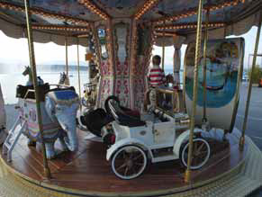 Nejstarší dochovaná vyobrazení této oblíbené zábavy pro malé i velké pochází z Byzance. Znázorňují postavy v košících otáčejících se kolem středové tyče. Do Evropy přivezli kolotoč křižáci, kteří ho okoukali od arabských jezdců ve 12. století. Koncem 15. století se ve Francii staly součástí turnajových slavností, kdy se jezdci v plném trysku snažili trefi t kopím do zavěšených kroužků. Ale až roku 1680 dostal kdosi nápad přidělat na nosníky ke střednímu sloupu dřevěné koně. Mladí šlechtici pak mohli z těchto fi - gur (otáčených koňmi, muly či sluhy) zasahovat malé kroužky zavěšené po vnějším obvodu kolotoče. Zájem o podobná zařízení projevil i prostý lid. Během dvou století se pak kolotoč rozšířil do ostatních částí známého světa. I přes velkou popularitu byl však stále omezen pohonem, který nadále zajišťovali koně, muly či lidé. To se změnilo roku 1870, kdy Angličan Frederick Savage užil k pohonu kolotoče parní stroj. V první polovině 20. století zaznamenal kolotoč další změny vzhledu i pohonu, došlo samozřejmě i na využití elektřiny. U nás ovšem ještě do roku 1939 existovaly kolotoče poháněné lidskou silou. Mělo to i své výhody, především pro kluky točící kolotočem, kteří se mohli vozit zadarmo. Vývoj šel však dál a přinesl závratnou rychlost pouťových atrakcí. Návštěvu těch nejrychlejších můžeme ale doporučit jen silným povahám.