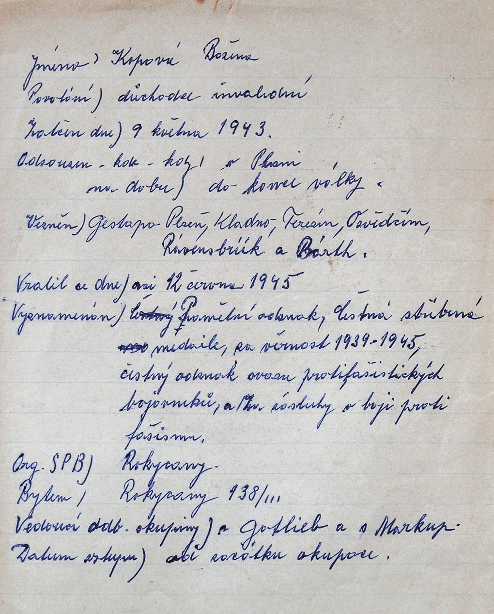 Na gestapu v Kladně ji dokonce bili šavlemi do nohou. Do smrti jí zůstala na tyto výslechy památka – ohluchla na levé ucho. První dopisy z gestapa psala ještě neumělou němčinou, drobným a poměrně úhledným písmem. Výslechy, mučení, hlad, stres, to vše se postupně začalo odrážet na rukopisu, kde rozmáchlá, špatně čitelná slova, psaná spíše silou vůle, dávala tušit, co prožívá. Když s ní gestapo „skončilo“, dostala označení RU (Rückkehr unerwünscht – návrat nežádoucí), 18. 7. 1943 ji převezli do terezínské Malé pevnosti. Božena Kopová prošla plzeňským a kladenským gestapem, Malou pevností Terezín, Osvětimí, Ravensbrückem, lágrem Barth a přežila dokonce pochod smrti.
