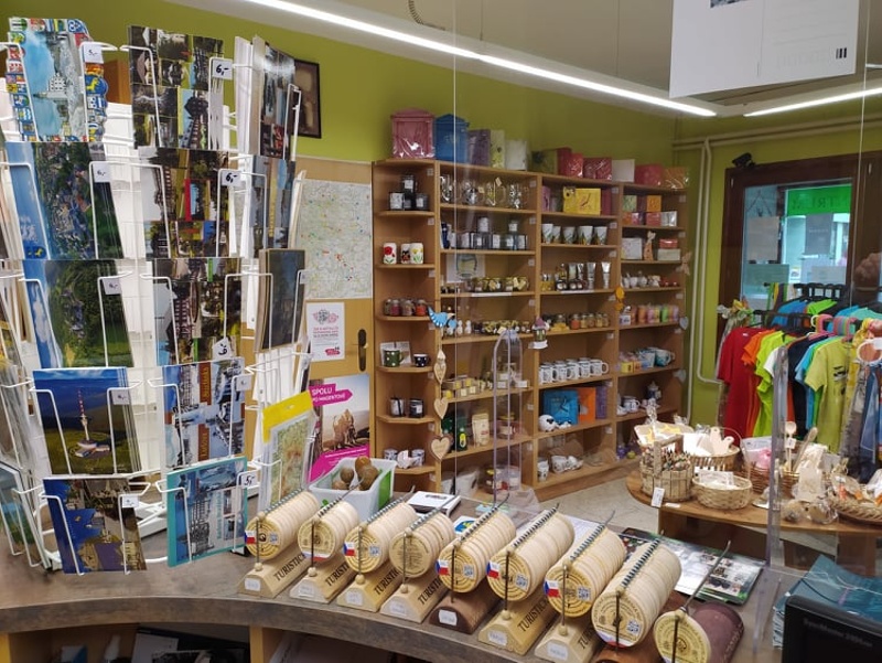 co prodáváme: upomínkové a dárkové předměty či suvenýry s logem města (keramika, ručně malované sklo, svíčky, čaje, korálky, suvenýry apod.), Originální jesenické produkty