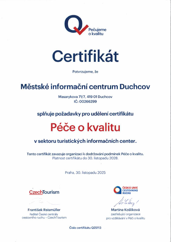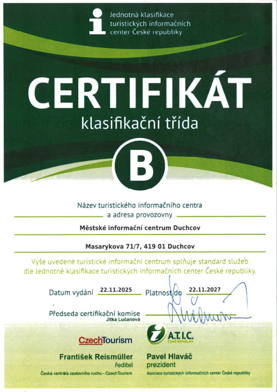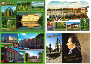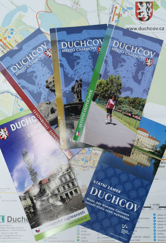 Duchcov, město s devíti tisíci obyvateli, ležící na úpatí Krušných hor 8 km západně od Teplic, poskytne svým návstěníkům množství přírodních, hitorických, kulturních zajímavostí. Duchcov, kde žil na zámku G. Casanova. Muzeum města Duchcova s interaktivní expozicí Já Giacomo Casanova, expozicí historie města, atriem, kde si posedíte s G. Casanovou a expozice věnovaná místní továrny HIKO. Evangelický kostel s vyhlídkovou věží. Liptická vyhlídka na vrcholků výsypky Pokrok. Historie Duchcova se odvíjí od konce 12.st., nejstarší písemný záznam o něm je z roku 1240. V roce 1460 český král Jiří z Poděbrad uděluje městu městský zank a městskou pečeť. Příslušnost města k české koruně ve znaku dokládá dvouocasý lev na štítu s třemi červenými a dvěma černými svislými pruhy. V 15.st. potvrzuje český král Vladislav Jagelonský městu jeho výsady.