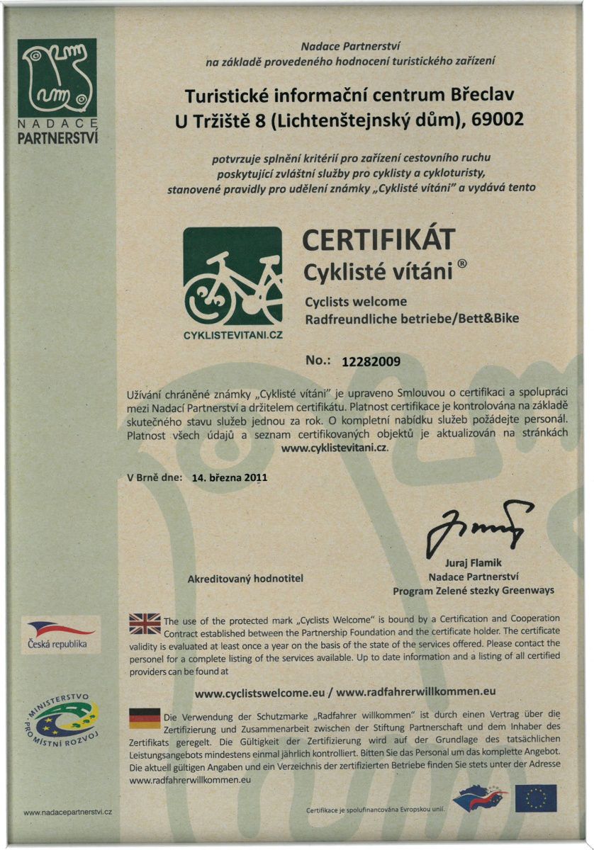 Jsme oficiálním turistické informační centrum České republiky a také zařízením certifikovaným v rámci celonárodního projektu Cyklisté vítáni.