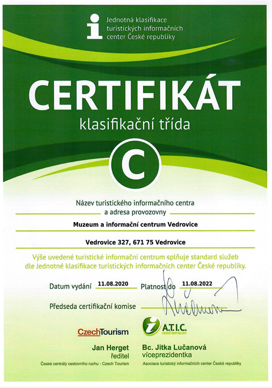 V části s certifikovaným turistickým informačním centrem dále získají turisté a návštěvníci cenné informace o Vedrovicích a mikroregionu Moravskokrumlovsko, co se týká kultury, památek, ubytování, stravování, volnočasového vyžití i dopravní dostupnosti.