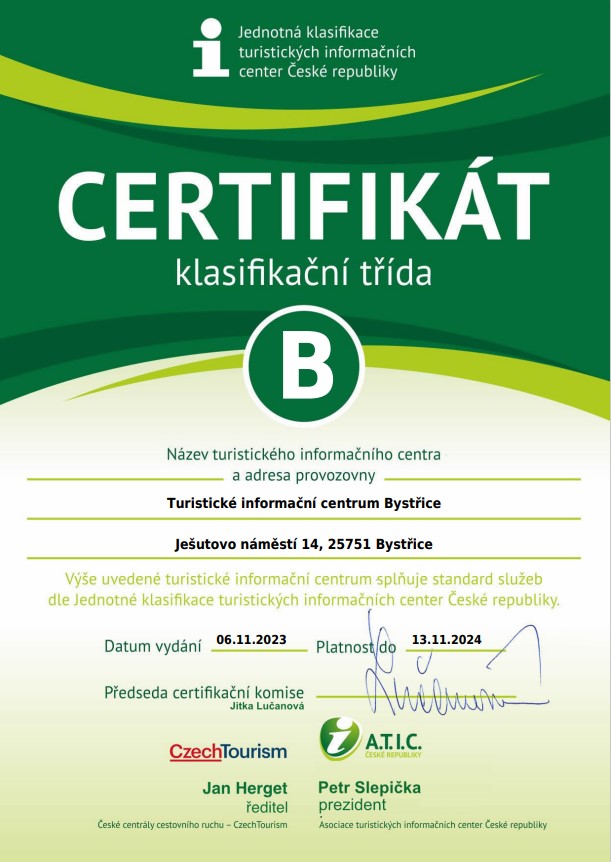 Turistické informační centrum Bystřice bylo otevřeno 17. 11. 2022 v historickém domě U Jelena. Načerpat zde můžete i turistické inspirace pro výlety do okolí. Prostřednictvím historických fotografií nahlédnout do historie Bystřice a přilehlých osad. Připomenout si již neexistující domy, místa, ale také společenské a sportovní akce, které se zde v minulosti uskutečnily.