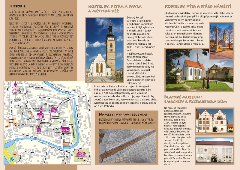 průvodci / prohlídky: V červenci a srpnu nabízíme komentované prohlídky historickou částí města, jejich součástí je návštěva kostela sv. Petra a Pavla, kostela sv. Víta a knihovny v areálu Rožmberského hradu.