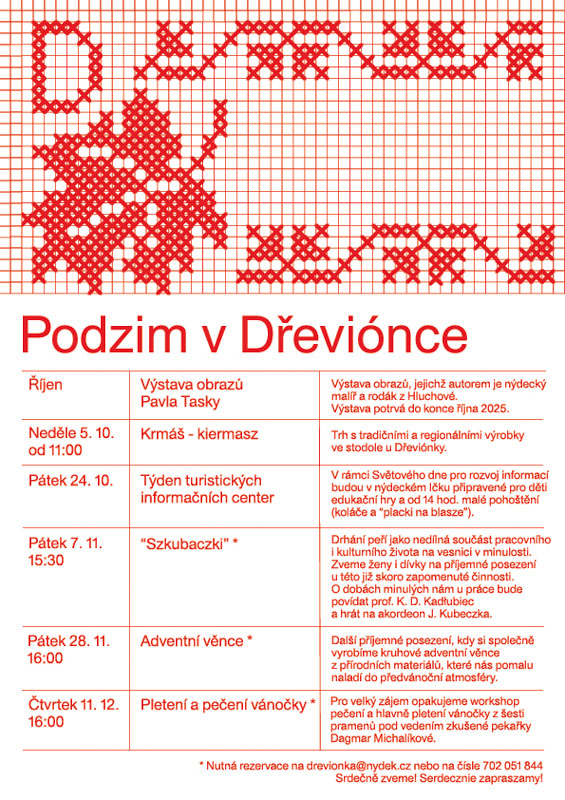 Dřeviónka Nýdek nabízí návštěvníkům bezplatné informace týkající se turismu a kultury v blízkém okolí, prodej suvenýrů či sortiment map a turistických letáčků. Součástí je i malé muzeum se světnici a replikou stodoly, kde probíhají námi připravované akce a workshopy.